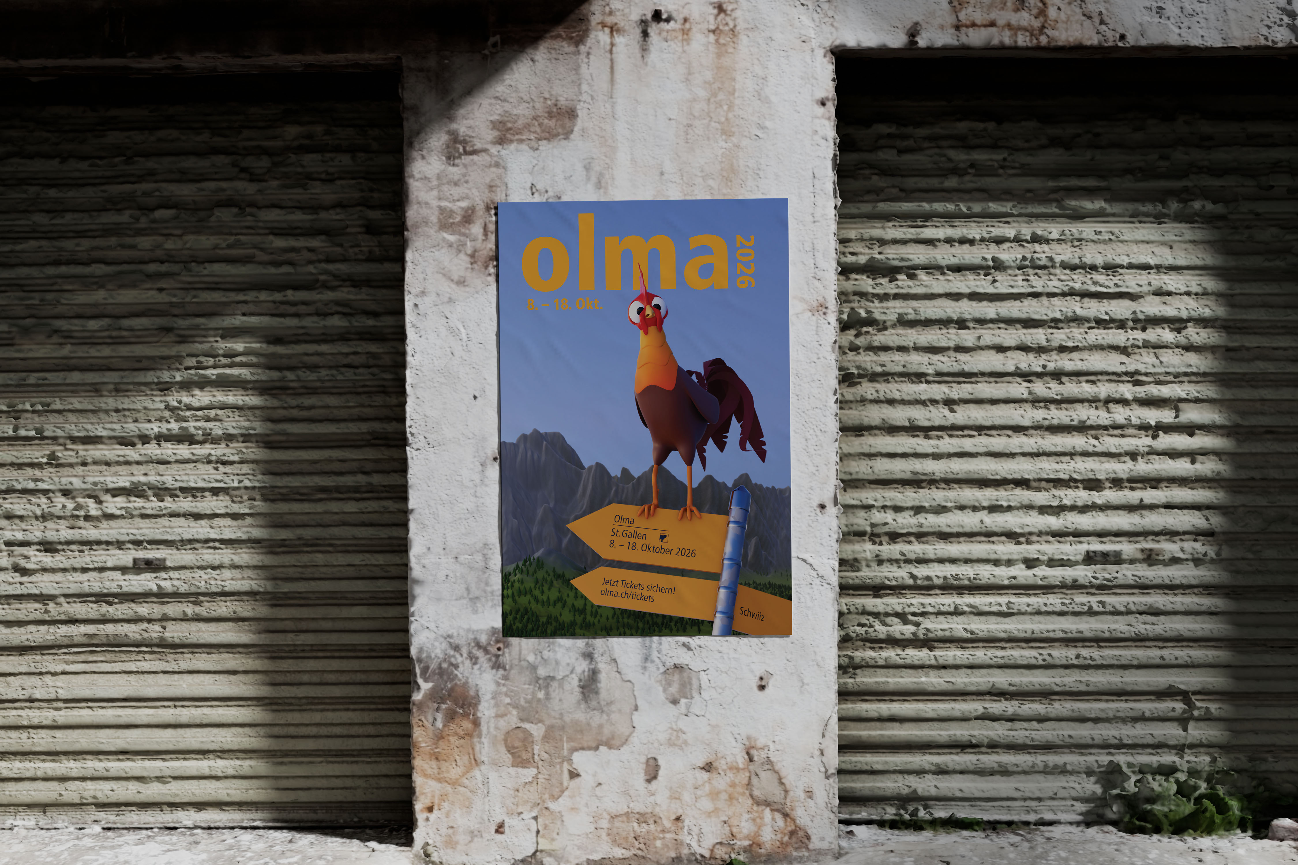 Für den OLMA-Plakatwettbewerb 2026 entwickelte ich ein eigenständiges Keyvisual. Das OLMA-Team wünschte sich dieses Jahr ein bewegtes Visual, das digital animiert und zugleich als Plakat funktioniert.Im Zentrum steht ein charaktervoller Hahn vor alpiner Kulisse – modelliert, geriggt und gerendert in Blender. Ziel war es, die landwirtschaftliche Tradition der OLMA mit einer zeitgemässen 3D-Ästhetik zu verbinden und ein aufmerksamkeitsstarkes Motiv für beide Formate zu schaffen.